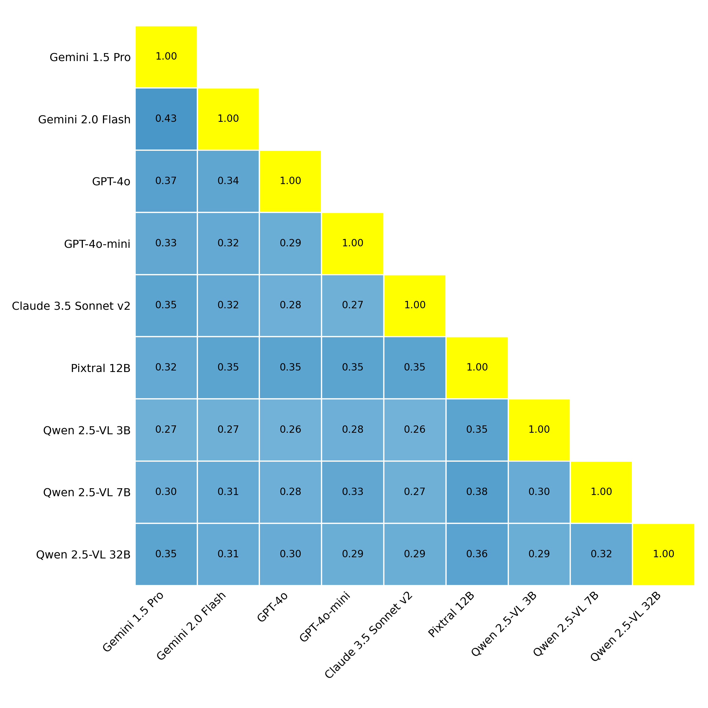 And what this shows us is that there seems to actually be relatively little overlap. Interestingly, models of the same family (the 4os, the Geminis, and the Qwen2.5-VLs) don’t seem to have significantly more overlap between themselves, despite most likely having been trained on very similar data.