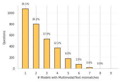 We were also curious about the mismatch distribution, that is, how many questions cause degradations in a certain number of models?: